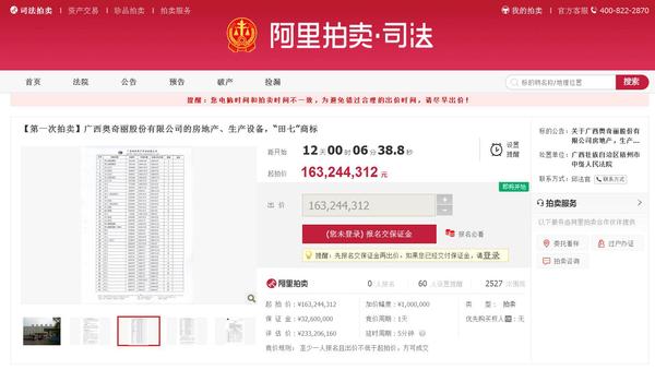 5月30日,中新经纬客户端在阿里司法拍卖平台看到,“田七”商标及其所属公司广西奥奇丽股份有限公司(下称“奥奇丽”)的房地产、生产设备等将于6月11日上午10时被拍卖,起拍价为1.63亿元,加价幅度为100万元,参与拍卖需缴纳保证金3260万元。