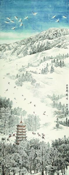 2022年冬奥会即将在北京举行。延庆素有北京夏都之美誉,作为冬奥会的赛区之一,备受期待。方政和、魏葵描绘的《冬奥铸辉煌》是艺术家对冬奥会的畅想之作。滑雪的人物点缀入景,万里碧空与皑皑白雪相互呼应,空中盘旋的飞鹤则表达了对冬奥会的美好祝福。