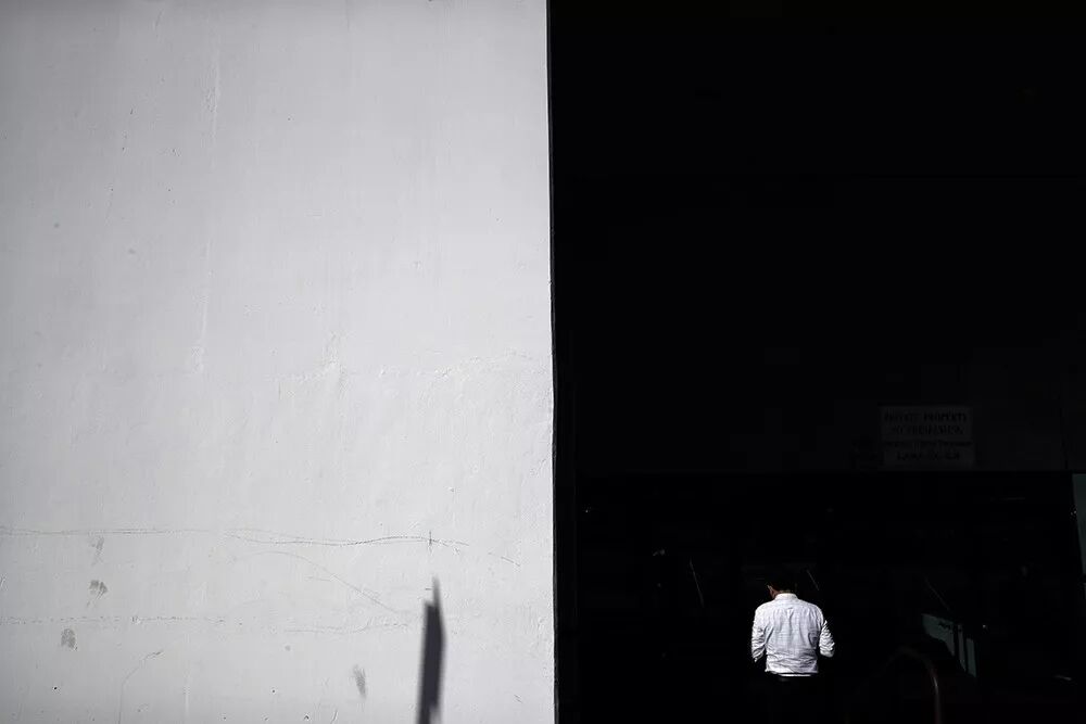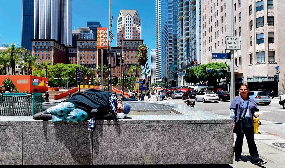 5月24日,洛杉矶市中心,一位行人从一名露宿街头的无家可归者旁边经过