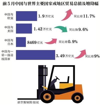 海关总署方面还表示,今年前5个月,我国对“一带一路”沿线国家进出口增速高于整体。数据显示,1-5月,我国对“一带一路”沿线国家合计进出口3.49万亿元,增长9%,高出全国整体增速4.9个百分点,占我国外贸总值的28.8%,比重提升1.3个百分点。