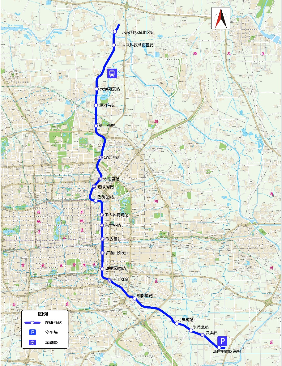 为进一步满足地区公共交通出行需求,北京市加快建设17号线的同时,启动了地铁13号线扩能提升工程方案研究工作。其中,17号线全长50公里,南起亦庄新城站前区,经朝阳港、第一使馆区、朝阳门外商业区、北京商务中心区(CBD)、工人体育场、太阳宫居住区、望京居住区、天通苑地区等区域后进入昌平区未来科学城,全线共设21座车站,其中换乘站10座。项目已于2015年开工建设,计划于2022年底开通试运营。