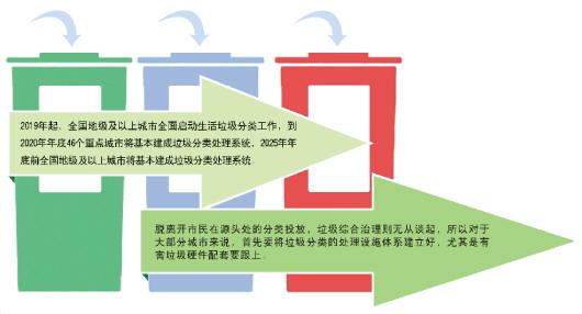 推进垃圾分类工作,一份清晰的日程表已经呈现在眼前:2019年起,全国地级及以上城市全面启动生活垃圾分类工作,到2020年年底46个重点城市将基本建成垃圾分类处理系统,2025年年底前全国地级及以上城市将基本建成垃圾分类处理系统。