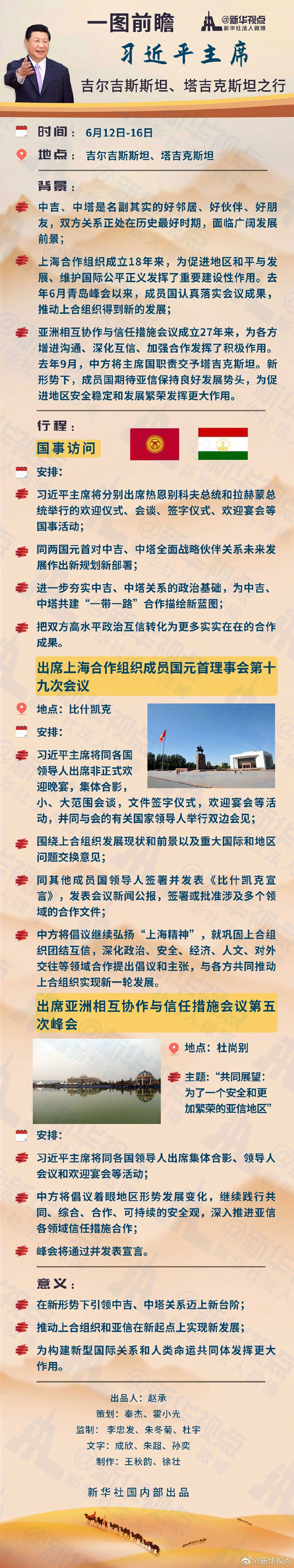 习近平主席将于6月12日至16日对吉尔吉斯斯坦、塔吉克斯坦进行国事访问并出席在比什凯克举行的上海合作组织成员国元首理事会第十九次会议和在杜尚别举行的亚洲相互协作与信任措施会议第五次峰会。这次出访有啥看点?戳图秒懂