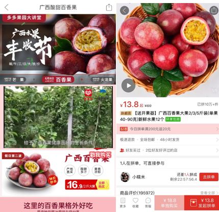 6月7、8、9三天,每月一次的拼多多“丰收节”如约而至,此次拼多多把目的地放在了水果品类丰富的广西?!?18”大促背景下,“广西丰收节”持续推高平台水果消费热潮,包括广西台芒、百香果、红心火龙果在内的特色农产品,上线即被消费者火热抢购。