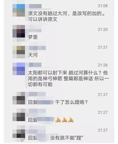 还有一派家长挺乐呵,他们说,“干了的河不是河吗?这是赤裸裸的歧视!”“人家腿长,大河也能蹚!”“太阳都可以射下来,过河算什么,他用的是神弓神箭,整篇都是神话,一切皆有可能!”