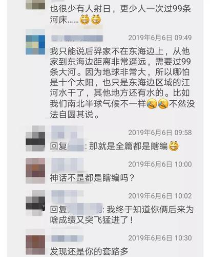一位媒体工作者解释:大河可能因为海水倒灌而存,江河泛指小江小河,与大河不一样。网友“七个葫芦娃姥姥”也很认真地说,“我只能说后羿的家不在东海边上,从他家到东海边距离非常遥远,需要过九十九条大河,因为地球非常大,哪怕是十个太阳,也只是东海边区域的江河水干了,其他地方还有水。比如我们南北半球的气候不一样?!?/p>