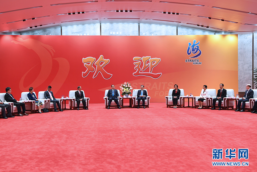 6月16日,中共中央政治局常委、全国政协主席汪洋在厦门出席第十一届海峡论坛并致辞。这是论坛开幕前,汪洋会见出席论坛的部分两岸嘉宾和主办单位代表。 新华社记者 饶爱民 摄