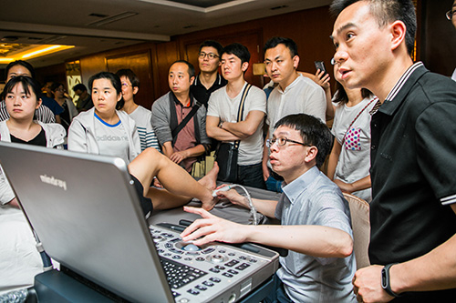 在华西可视化大会的培训班上,来自各地的医师学员们一边认真仔细地听讲,一边用手机记录着授课的过程。一位学员表示,“通过老师的讲解,平时遇到的许多问题都被一一解答。而且,在老师的指导和演示下,操控探头的手法也得到了纠正?!?/p>
