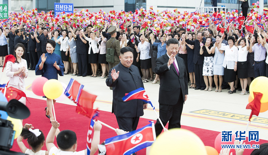 当地时间下午3时许,在朝鲜民众夹道欢送中,习近平和彭丽媛抵达机场,金正恩夫妇在下车处热情迎接。朝鲜各界群众在机场热烈欢送,习近平向他们挥手致意。军乐队奏中朝两国国歌,习近平在金正恩陪同下检阅了朝鲜人民军三军仪仗队。朝鲜少年儿童向习近平夫妇献花。习近平同朝方前来送行的高级官员一一握手告别。在专机舷梯旁,习近平同金正恩紧紧握手话别。习近平夫妇迈上舷梯,在机舱门口转身,向金正恩夫妇挥手告别。