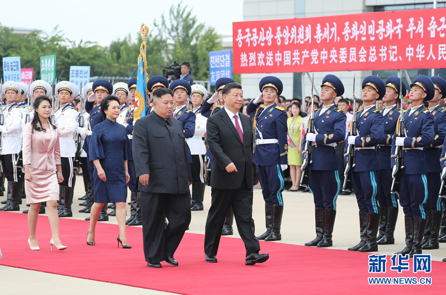 6月21日,中共中央总书记、国家主席习近平结束对朝鲜的国事访问离开平壤回国。离开前,习近平和夫人彭丽媛出席朝鲜劳动党委员长、国务委员会委员长金正恩和夫人李雪主在机场举行的欢送仪式。新华社记者 鞠鹏 摄
