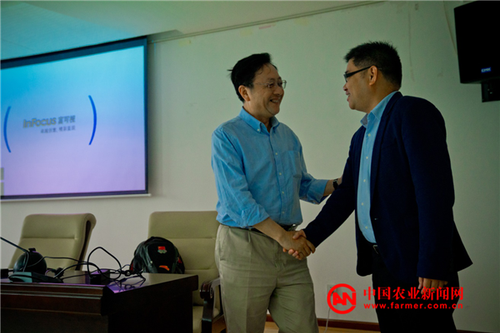 ▲多多大学丘北公开课上,文山州扶贫办副主任、丘北县委常委、副县长黄海滨(右)与前来授课的中国农业大学教授王增利(左)握手