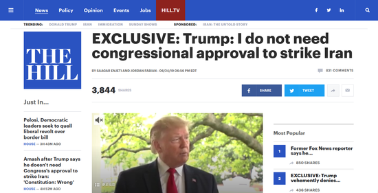【环球网报道】美伊紧张局势持续升级。据美国《国会山报》24日报道,特朗普当天在接受专访时表示,他打击伊朗不需要获得国会的批准。