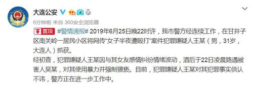 中新网6月25日电 据大连市公安局官方微博消息,25日晚22时许,大连市警方经连续工作,在甘井子区南关岭一居民小区将网传“女子半夜遭殴打”案件犯罪嫌疑人王某(男,31岁,大连人)抓获。