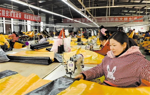 新蔡县龙口镇群众在扶贫车间加工快递包装袋。 宋超喜摄(中经视觉)