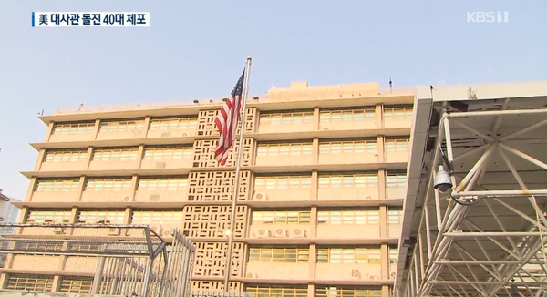 遭到冲撞的美国驻韩大使馆(KBS电视台)