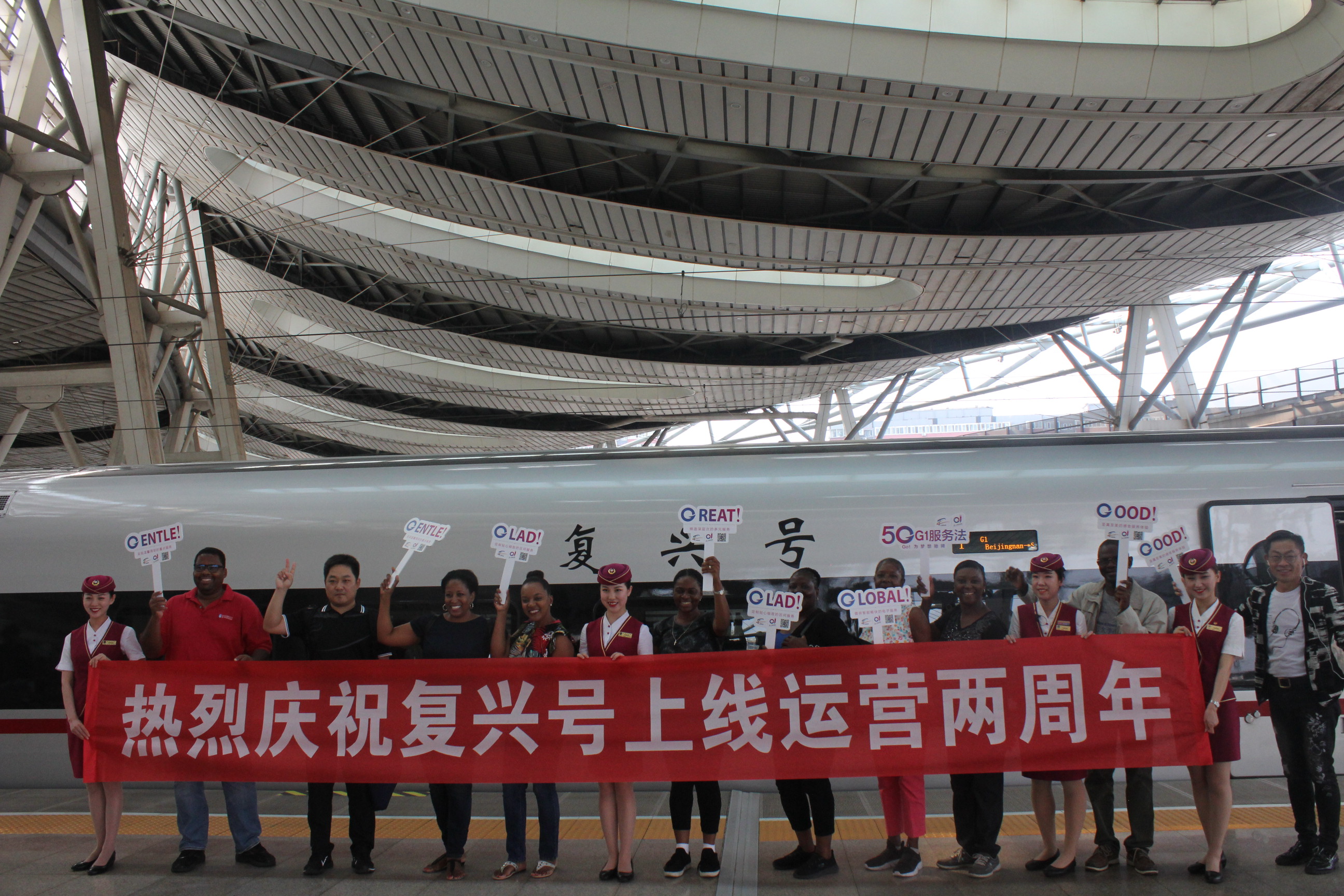 在复兴号动车组“两周岁”生日之际,天津客运段值乘的北京南站至上海虹桥站的G1次列车上,乘务员与旅客一起共同为复兴号切蛋糕庆生。6月26日也是国际禁毒日,乘务员担当禁毒宣传志愿者,在复兴号列车上向旅客发放禁毒宣传册和纪念品,邀请公安乘警为旅客讲解禁毒知识。大学生包乘组是天津客运段津京沪车队G1次列车的服务品牌,他们秉承着“享受服务,快乐旅行”的服务理念,运用5G服务法(Good、Great、Gentle、Glad、Global),两年来获得了4万份旅客调查满意度95%以上的好评。