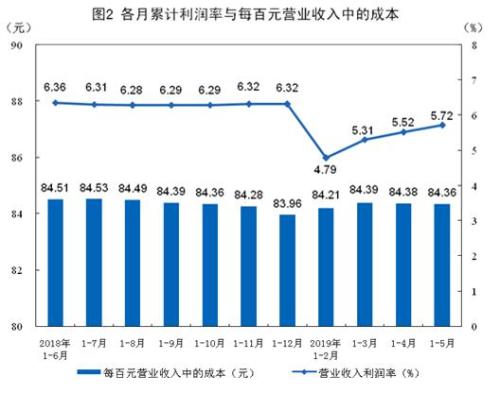 1—5月份,规模以上工业企业实现营业收入41.61万亿元,同比增长5.1%;发生营业成本35.10万亿元,增长5.4%;营业收入利润率为5.72%,同比降低0.43个百分点。