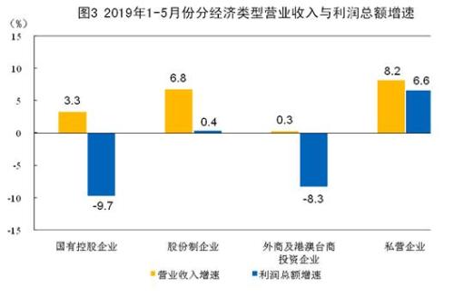1—5月份,规模以上工业企业中,国有控股企业实现利润总额7342.3亿元,同比下降9.7%;股份制企业实现利润总额16993.1亿元,增长0.4%;外商及港澳台商投资企业实现利润总额5775.8亿元,下降8.3%;私营企业实现利润总额6072.7亿元,增长6.6%。