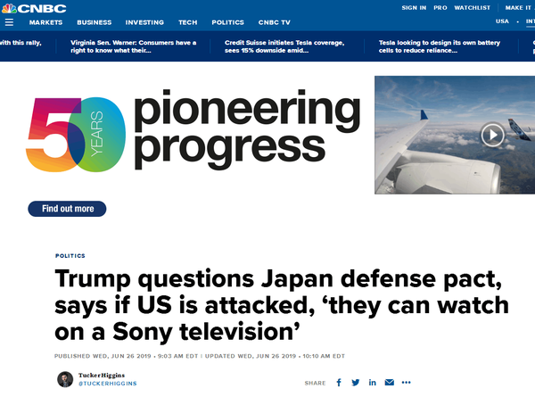 特朗普怼日本:美国遭袭 他们可只在索尼电视上围观