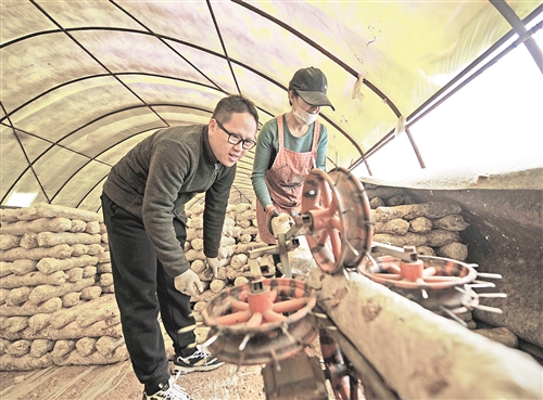 陈拔群(左)在河北平泉哈叭气村食用菌园区与村民一起制作菌袋。(资料图片)