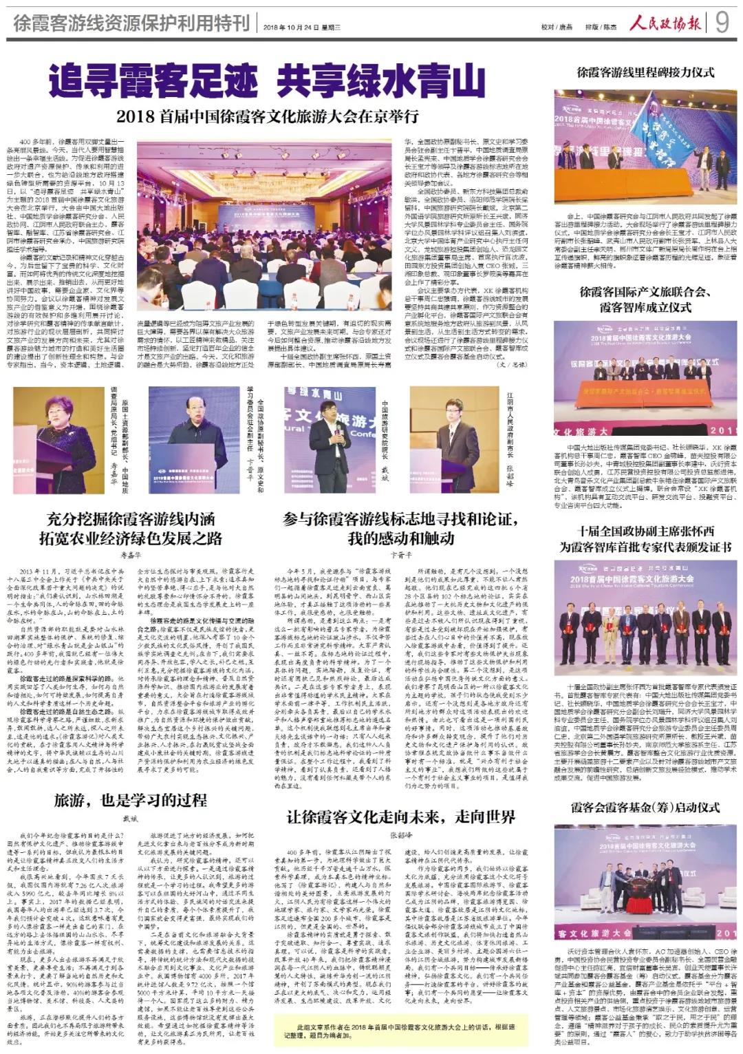400多年前,徐霞客用双脚丈量出一条亮丽风景线。今天,当代人要用智慧描绘出一条幸福生活线。为促进徐霞客游线政府对遗产资源?;?、传承和利用的进一步大联合,也为给沿线地方政府搭建绿色转型所需要的资源平台,10月13日,以“追寻霞客足迹共享绿水青山”为主题的2018首届中国徐霞客文化旅游大会在北京举行,大会由中国大地出版社、中国地质学会徐霞客研究分会、人民政协网、江阴市人民政府联合主办,霞客智库、融智库、江苏省徐霞客研究会、江阴市徐霞客研究会承办,中国旅游研究院担任学术指导。