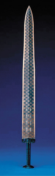 1965年12月,湖北江陵一座楚国贵族的墓葬中,考古工作者发现了600多件文物,一柄青铜剑在棺内的人骨左侧放置,还插入涂有黑漆的木制剑鞘之内。一名开采队员在拿剑时一不留神将手割破,血流不止,这时,剑已历经2400余年,足见宝剑的锋利。宝剑全长55.7厘米,宽4.6厘米,剑柄长8.4厘米,重876克,身上布满了规则的黑色菱形暗格花纹,在剑柄和剑身的中间被称为“剑格”的地方,正面镶嵌着蓝色玻璃,背面镶嵌着绿松石;剑身靠近剑格的地方有两行鸟虫书铭文,应为:“越王鸠浅(勾践) 自乍(作)用剑”八字,证明着宝剑主人的身份。