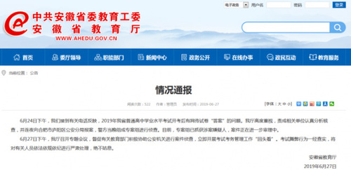 安徽教育厅回应高中会考"泄题":已抓获涉案嫌疑人