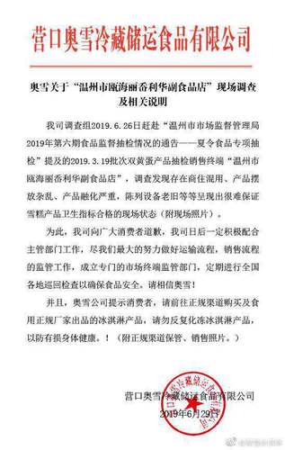 6月29日,营口奥雪冷藏储运食品有限公司微博再次发布关于“温州市瓯海丽岙利华副食品店”现场调查及相关说明。说明中显示,该公司调查组6月26日赶赴“温州市市场监督管理局2019年第六期食品监督抽检情况的通告夏令食品专项抽检”提及的2019年3月19日批次双黄蛋产品抽检销售终端“温州市瓯海丽岙利华副食品店”,调查发现存在商住混用、产品摆放杂乱、产品融化严重,陈列设备老旧等等呈现出很难保证雪糕产品卫生指标合格的现场状态。