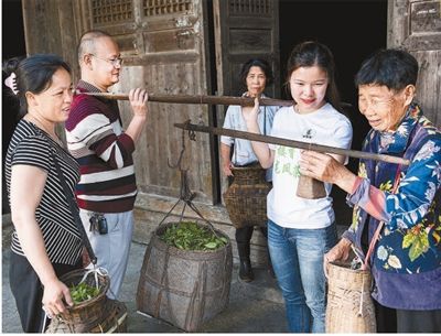 近日,林莹(右二)上门收购贫困户采摘的茶叶。
