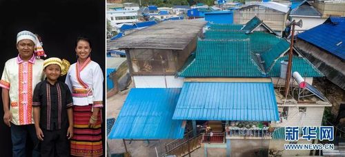 左图:芒市西山乡营盘村芒良村民小组景颇族村民董跑腊(后排右)一家合影(6月20日新华社记者胡超摄);右图:董跑腊家2017年翻修的房子。董跑腊在当地糖厂打工,还养殖竹鼠,经营沙滩旅游,全家年收入5万元左右(6月20日新华社记者秦晴摄)。