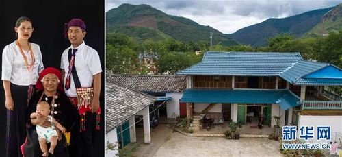 左图:普洱市西盟佤族自治县新厂镇永广村一组佤族村民呢秒(前排右)一家合影(6月15日新华社记者胡超摄);右图:呢秒家的新房2017年建好,旁边的老房子现在用作厨房。呢秒一家种植青贮玉米5亩,套种皇竹草20亩,主要用于企业养牛的饲料,年收入约10万元(6月15日新华社记者秦晴摄)。