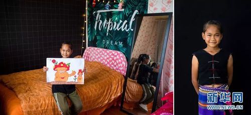 右图:叶多,佤族,今年11岁,勐卡镇小学四年级学生(6月15日新华社记者秦晴摄);左图:叶多在位于勐卡镇班哲村二组的家中卧室展示自己的绘画作品(6月15日新华社记者胡超摄)?;撬男巳ぐ?。