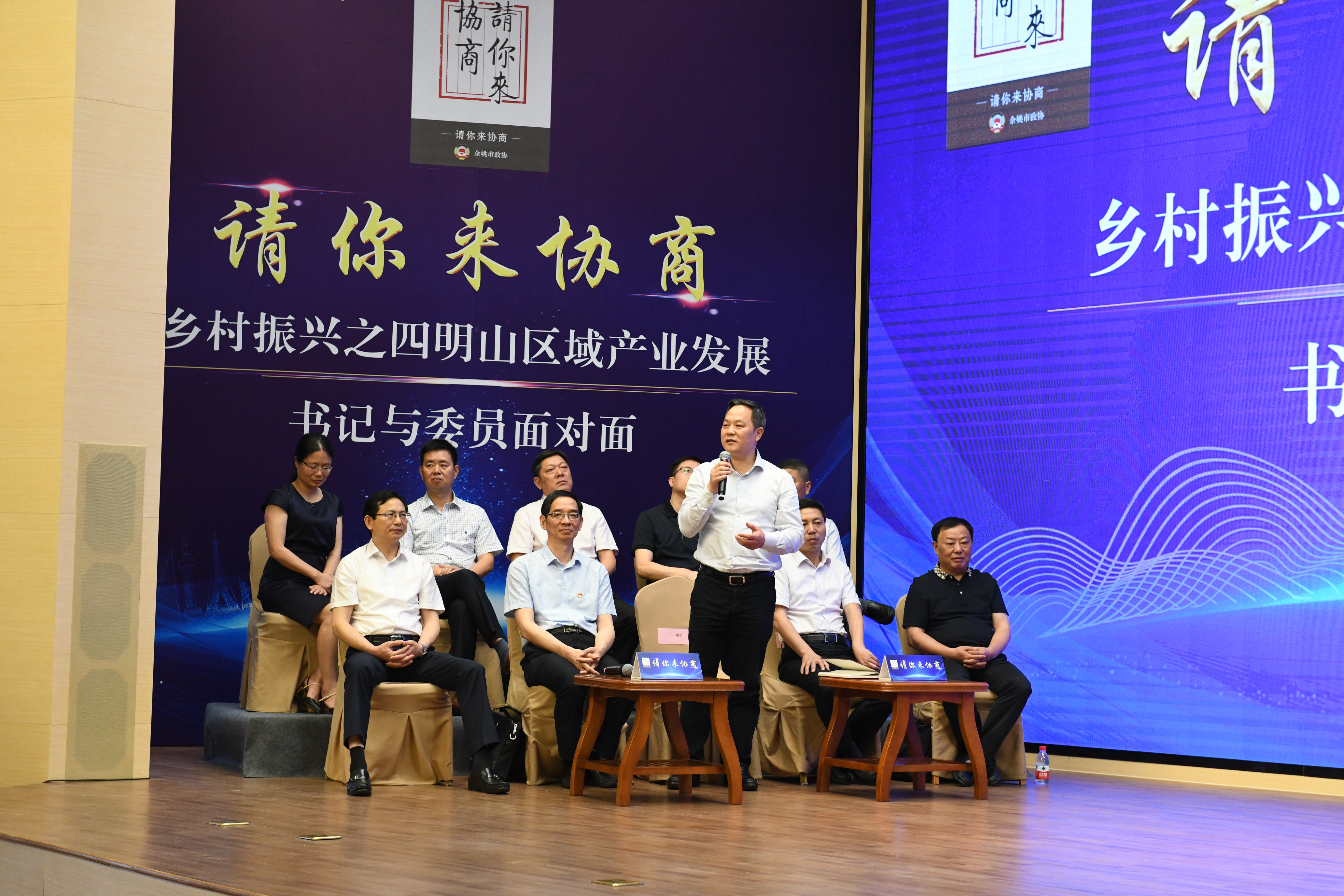 6月18日,在余姚横坎头村文化活动中心,余姚市委书记奚明、相关部门负责人与政协委员们面对面协商讨论乡村振兴,为四明山区域产业发展凝聚智慧和共识(右图)。