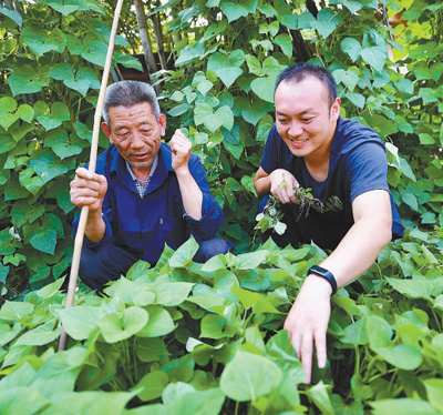 宋双双(右)在麻庙村贫困户袁志亮屋前的菜园里帮忙除草。