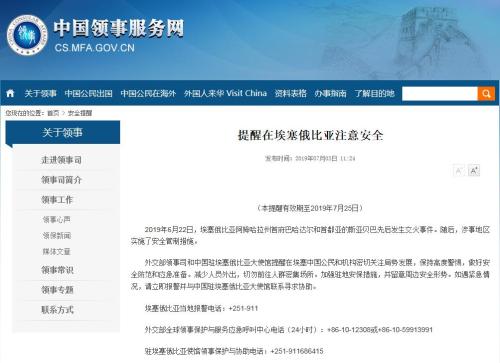 中新网7月3日电 据中国领事服务网消息,2019年6月22日,埃塞俄比亚阿姆哈拉州首府巴哈达尔和首都亚的斯亚贝巴先后发生交火事件。随后,涉事地区实施了安全管制措施。外交部领事司和中国驻埃塞俄比亚大使馆提醒在埃塞中国公民和机构密切关注局势发展,保持高度警惕,做好安全防范和应急准备。