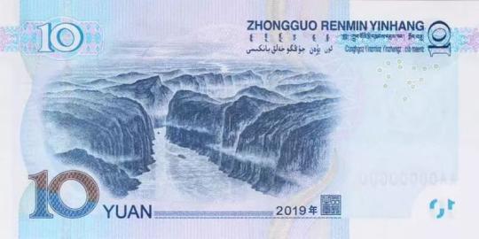 调整主景、面额数字、胶印对印图案的样式,取消全息磁性开窗安全线和右下角局部图案,年号改为“2019年”。