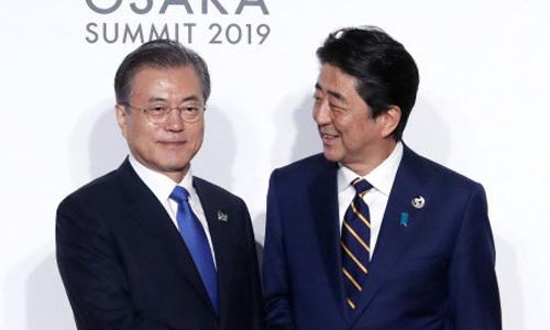 G20峰会,安倍晋三与文在寅握手8秒后各自离开。(韩联社)