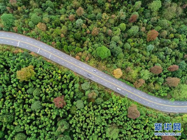 车辆行驶在国家第一条四车道盘山公路泰井高速上(2018年11月21日无人机拍摄)。新华社记者 胡晨欢 摄
