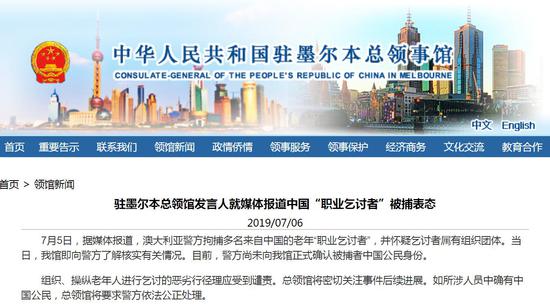 中国驻墨尔本总领馆网站7月6日消息,7月5日,据媒体报道,澳大利亚警方拘捕多名来自中国的老年“职业乞讨者”,并怀疑乞讨者属有组织团体。当日,我馆即向警方了解核实有关情况。目前,警方尚未向我馆正式确认被捕者中国公民身份。