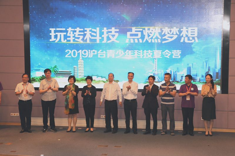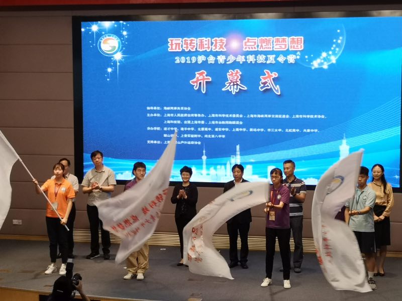 海峡两岸关系协会巡视员张娟、上海市科学技术协会副主席陈丽、上??萍脊莞惫莩す饲焐⑻松虾J形厥槌だ詈S?、上海市台湾同胞联谊会副会长甘平、上海市科委港澳台科技合作办公室副主任方德佳、浦东台办副主任钱月明、上海市进才中学校长胡瑞峰等两岸嘉宾出席开营仪式并为各分营授旗。10位领导和嘉宾共同启动“玩转科技 点燃梦想——2019沪台青少年科技夏令营”。主办方还为沪台青少年安排了科技秀《压力山大》,该剧曾获得全国科学实验展演金奖,用生动的科学实验验证地球上我们无时无刻承受的压力。同时开展观看科普影片欣赏等丰富多彩的科普活动。