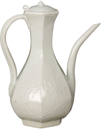 图为“南海Ⅰ号”沉船的德化窑青白釉印牡丹纹六棱带盖执壶。