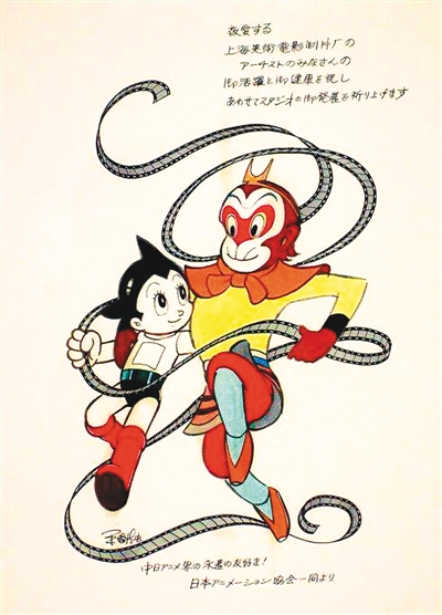 在这些作品中,有一幅日本漫画家的作品备受瞩目:画面上,孙悟空和阿童木亲密相拥,身边环绕着胶卷,两人满脸欢笑——那便是手塚治虫赠予上海美术电影制片厂的《孙悟空与阿童木》。