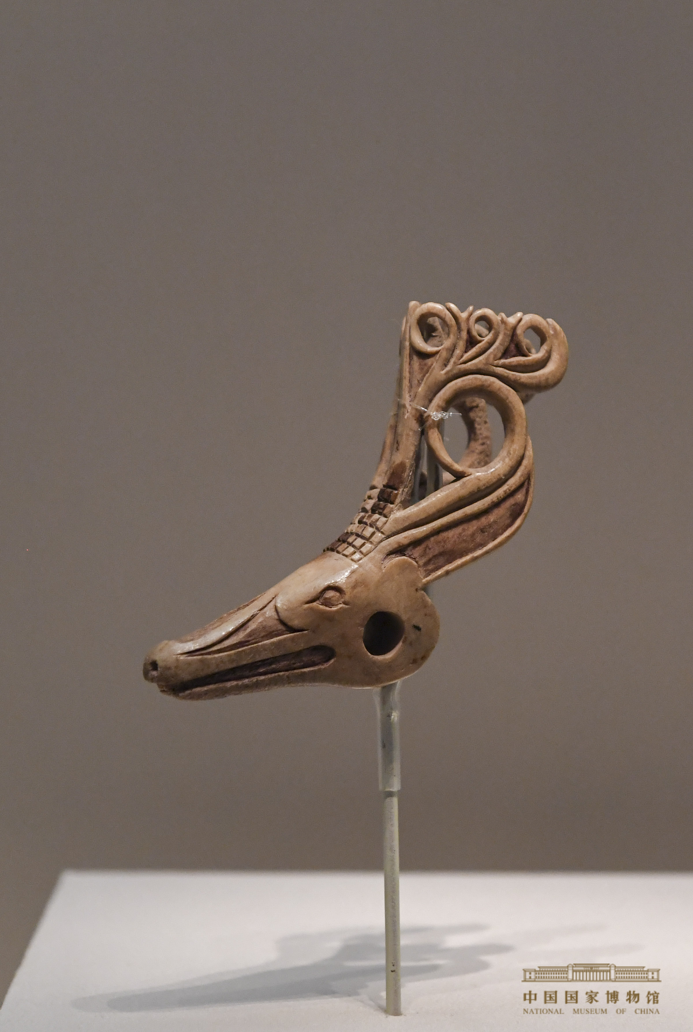 骨雕鹿头-汉代-1994年吐鲁番交河沟北1号台地28号墓出土,新疆维吾尔自治区博物馆藏
