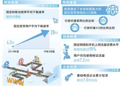 与五年前相比,宽带平均下载速率提升约6倍,上网流量资费水平降幅超90%