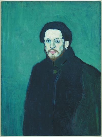 毕加索在拉维尼昂广场上的巨幅肖像照,引我们走进展览的第二个“盒子”——“蓝色和粉色毕加索”阶段。艺术家自1901年夏天,放弃了模仿前辈的后印象派绘画风格,转而塑造真正意义上最早的个人风格——蓝色时期。其特点是大量使用蓝色,选取感性的主题并在形式中寻求表现力。根据毕加索自己的说法,这个时期的创作始于1901年他的好友自杀,“我想念已经去世的卡萨吉玛斯,于是开始用蓝色来作画”。在极负盛名的《自画像》中,仅有20岁的毕加索面色枯槁,脸颊凹陷,除了嘴唇上的一丝血色,整个画面笼罩在阴冷的蓝色调中。