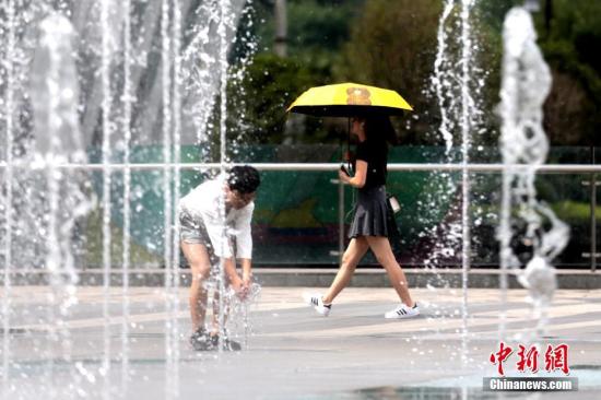 资料图,高温天气里,市民在喷泉旁消暑。中新社记者 张远 摄