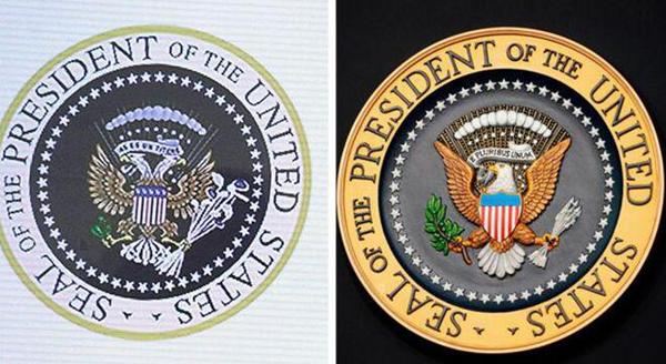 被恶搞的总统徽章(左)与真的总统徽章(右)
