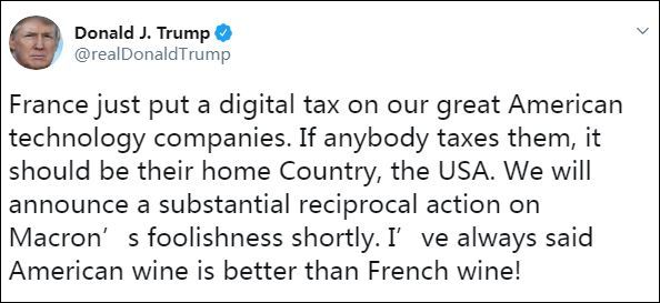 不出意料,美国总统特朗普生气了,点名马克龙很“愚蠢”,并誓言报复很快就来。他7月26日发了条愤怒的推特:“法国刚刚对我们伟大的美国科技公司征收了数字税。如果有人向他们征税,那也应该是他们的祖国——美国。对马克龙的愚蠢行为,我们将很快宣布实质性的对等行动。我一直说,美国葡萄酒比法国葡萄酒好?!?/p>