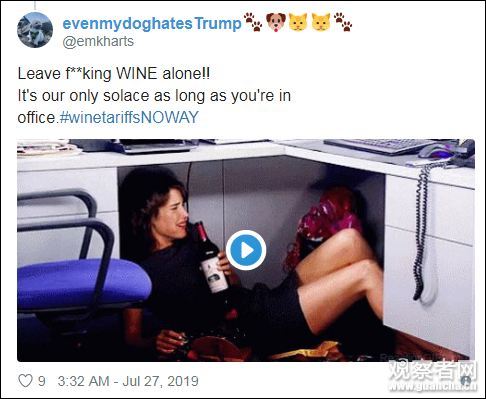 据CNN报道,特朗普后来还说:“可能是葡萄酒,也可能是别的什么东西,我们很快就会宣布。”特朗普表示,关税可能在即将于法国举行的七国集团会议之前出台(8月24至26日)。