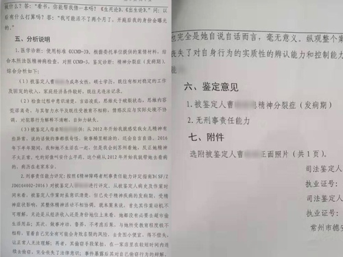 2019年4月3日,苏州工业园区人民法院委托常州市德安医院司法鉴定所,对曹丽娜案发当时的精神状态、有无刑事责任能力,进行司法鉴定。司法鉴定意见书显示,曹丽娜(化名),成年女性,硕士学历,医学诊断为“精神分裂症(发病期)”。 受访者供图